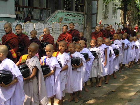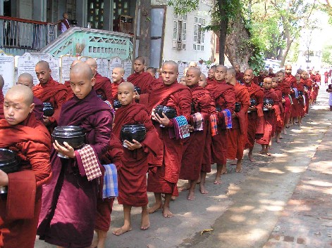 The program today was rather full so we had a reasonably early start. Our first port of call was to a factory where people weave the cloth for longyis. Unfortunately we didn't stay long so I was only able to buy a few for gifts but none for myself. The reason for the lack of time was our visit to the Mahagandayan Monastery. More than a thousand monks live and study there and our visit was to coincide with the monks second meal of the day. There were numerous tourists around, some of whom were not following the rules. NOTICES